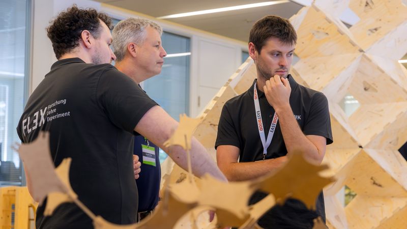 Mit Prof. Christopher Robeller (Hochschule Augsburg) kam die Forschung zu Wort. Sein Team untersucht, wie digitale Fertigungskonzepte helfen können, regionale Hölzer, krummwüchsiges Laubholz oder Restmaterialien präzise einzusetzen. Ziel ist es, Tragwerke leicht, modular und rückbaubar zu entwickeln – und damit neue Maßstäbe für Ressourcenschonung und Materialeffizienz im Holzbau zu setzen.